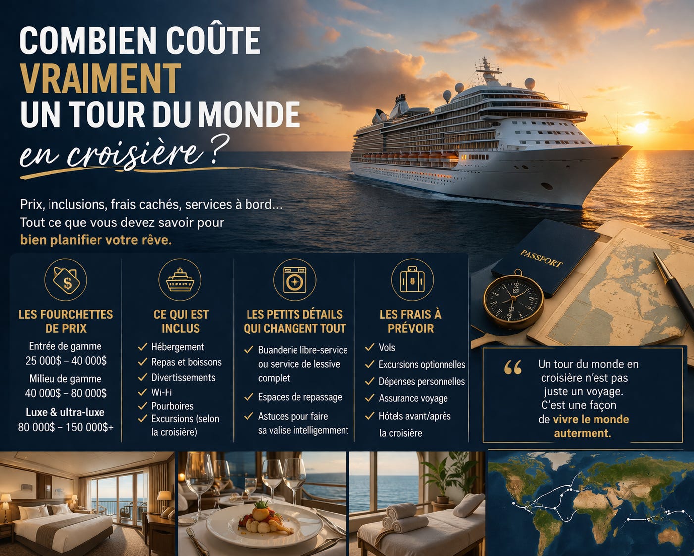 Une croisière complète autour du monde dure généralement entre 100 et 180 jours. Le spectre des prix le reflète, mais ce que ces chiffres incluent vraiment varie énormément.