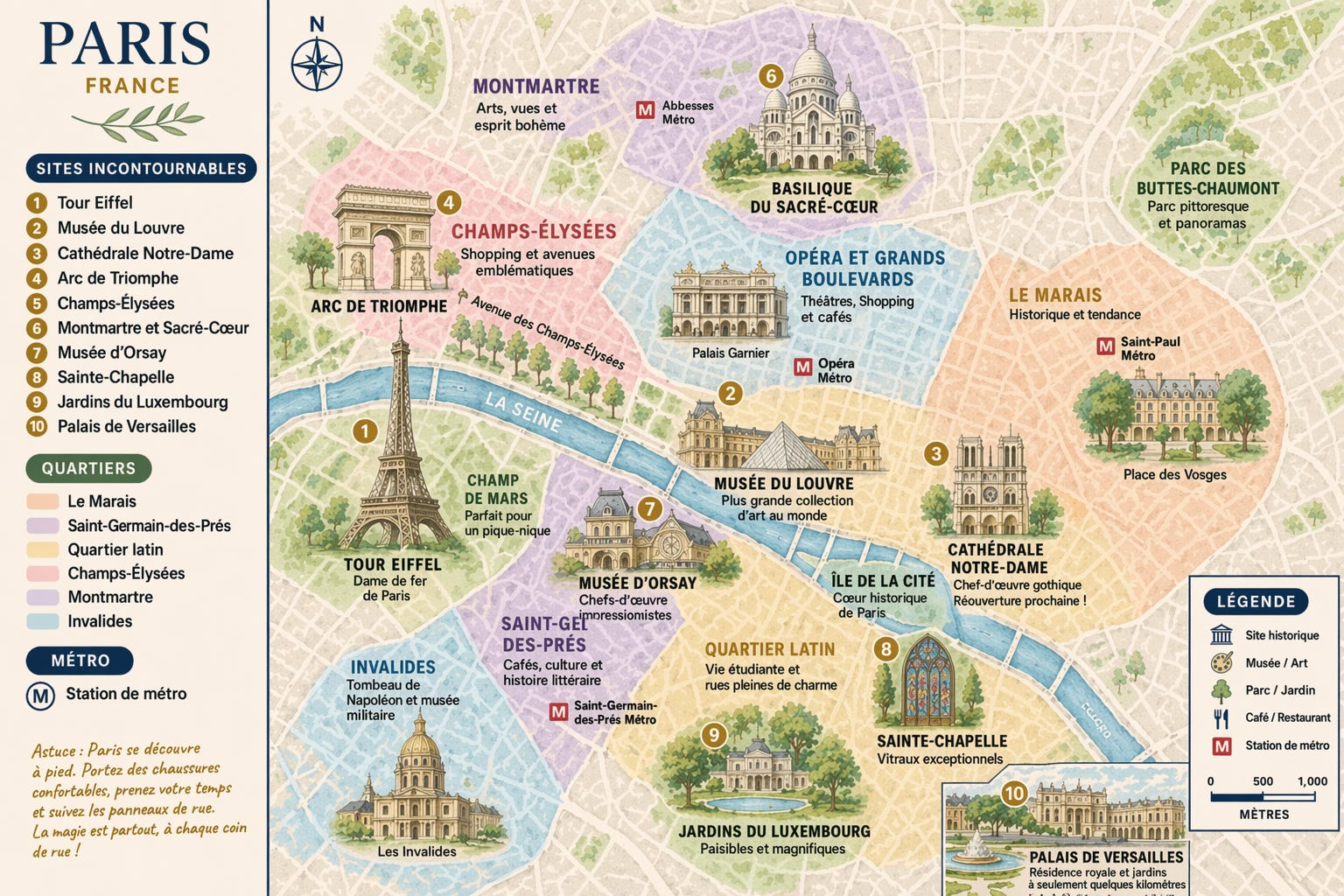 Quels quartiers les premiers visiteurs devraient-ils prioriser ? Le Marais pour son histoire et son énergie, Saint-Germain pour l’atmosphère parisienne classique, Montmartre pour les vues et l’ambiance village, et le Canal Saint-Martin pour une expérience plus contemporaine et locale.