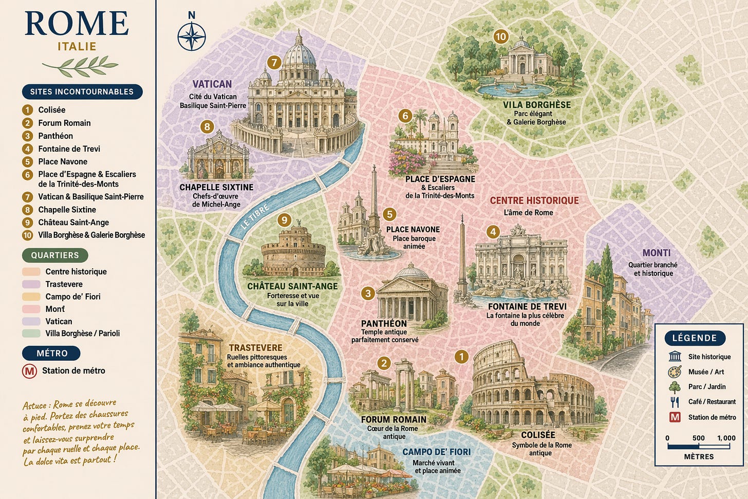 Le centre historique de Rome est assez compact pour le traverser à pied en une heure, mais chaque quartier a un caractère qu’il vaut la peine de comprendre avant d’arriver.