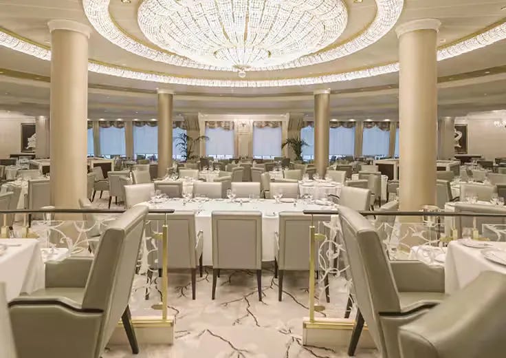 Le restaurant principal, ouvert à tous les repas. Les menus changent pour refléter les destinations visitées, avec des centaines de plats renouvelés à chaque mise à jour de flotte.